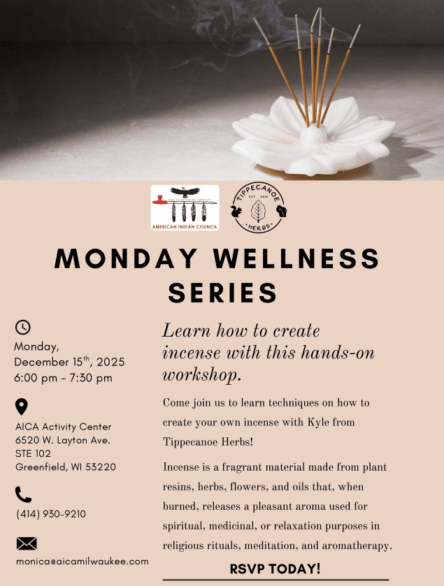 AICAJoin us on Monday Dec, 15th for our Wellness Series. Learn how to create incense with this hands-on workshop. RSVP- 414-930-9210 or email monica@aicamilwaukee.com