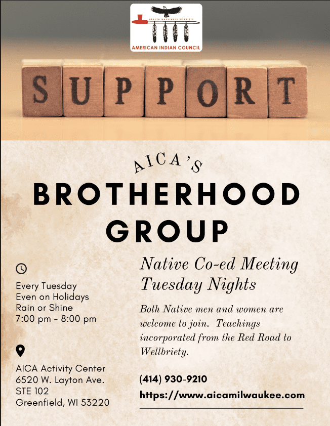 AICAAICA'S BROTHERHOOD GROUP Every Tuesday- Even on the holidays, rain or shine from 7:00 pm - 8:00 pm. AICA Activity Center 6520 W. Layton Ave. STE 102 Greenfield, WI 53220 Native Co-ed Meeting on Tuesday Nights. Both Native men and women are welcome to join. Teachings incorporated from the Red Road to Wellbriety. For information […]